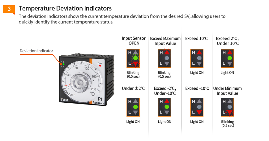 کنترلرهای دمای سری TA کنترل دمای ساده و دقیق را با استفاده واریابل آنالوگ ارائه می دهد. این کنترلر دارای قابلیت اتوتیونینگ PID کنترل دما و کنترل ON/OFF می باشد که با استفاده از سوییچ های خارجی تنظیم می شوند. نشانگر LED انحراف و نشانگر خروجی کنترلی دید کاملی از وضعیت پروسه ارائه می دهند.